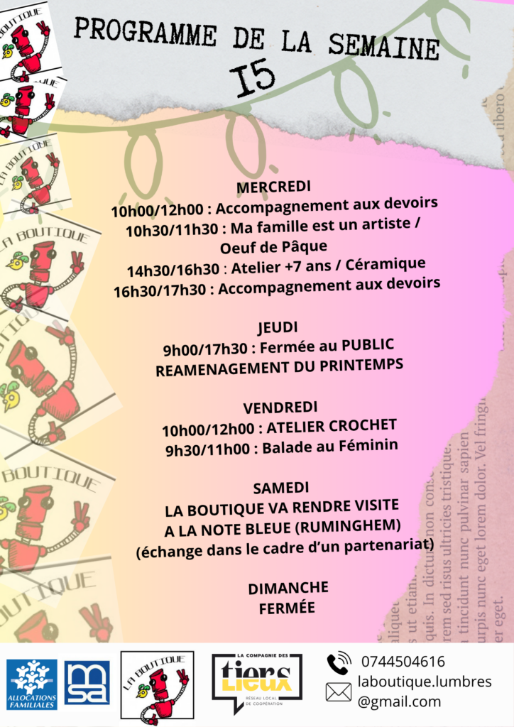 #LaBoutiqueLumbres #EVS #ProgrammeSemaine #VieLocale #TiersLieux #RéseauEVS #Partage #Création #Lumbres