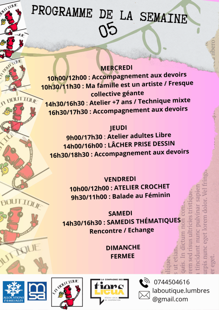 #ProgrammeDeLaSemaine #LaBoutiqueLumbres #EspaceDeVieSociale #AteliersGratuits #TempsAuFéminin #ParentsEnfants #Rencontres #Partage #Bienveillance 💛✨